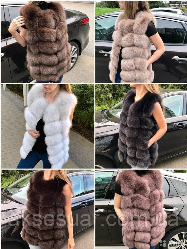 Жилет виконаний з добірних шкур песця на натуральній щільною замші, в колір хутра. Хутро щільний, густий і набитий, складний ідеально, без просвітів і пробілів між сотами, на сонечку має легкий, натуральний блиск. Застібається на гачки, жилет має шар утеплювача,що дозволить відчути його подвійне тепло і комфорт.